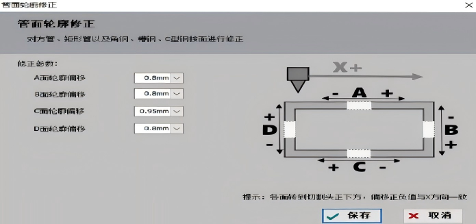 圓管:φ10~φ230mm; 方管、矩形管:邊長10~230mm;(全行程需開啟避讓功能,不用避讓功能存在撞前卡風險) 槽鋼:GB 5~18#; 角鐵:GB 2~11#; 工字鋼(需專業版套料支持):GB 10~18#; H型鋼(需專業版套料支持):H=100~180mm,B=50~125mm; |